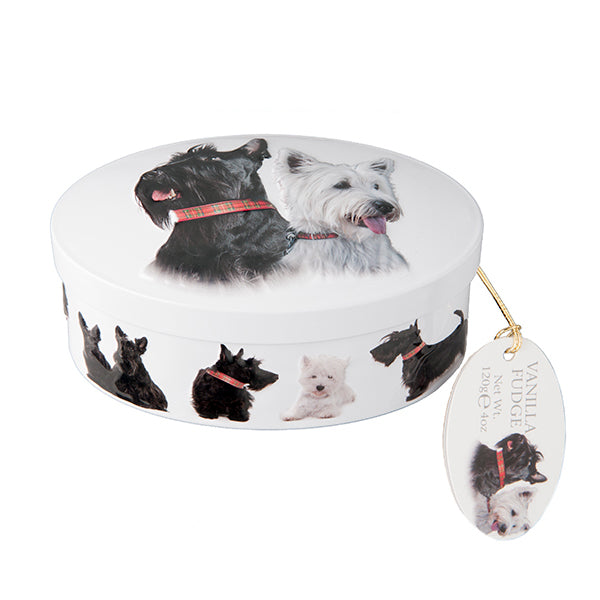 Delicious Vanilla Fudge in a beautiful collectable tin with Scotland’s very own ‘Wee Scotty Dog’. This lovely tin design makes for a fantastic gift for Dog lovers and indeed anyone who loves everything and anything about Scotland. With 120g of Handmade Scottish Vanilla Fudge inside, it is both a beautiful tin design and a yummy fudge within.